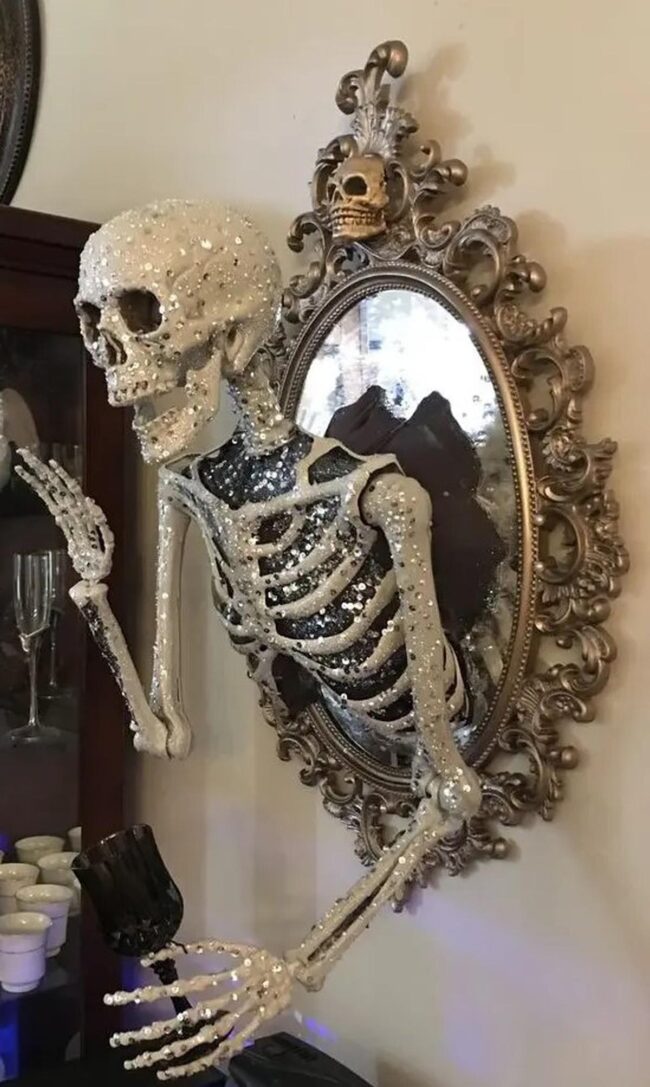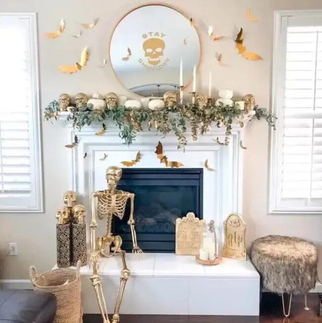 Sparkling skull designs peek from a round mirror above the fireplace, whispering festive messages that instantly draw your eye.
