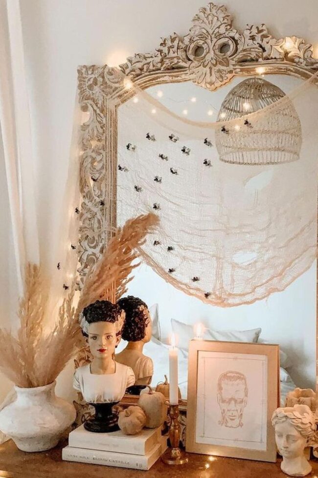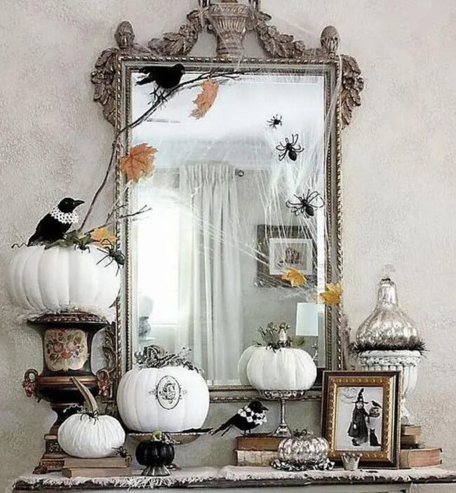 Neutral colors like white, gold, silver, and black ensure the Halloween elements shine without overwhelming your senses.