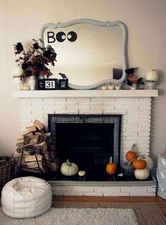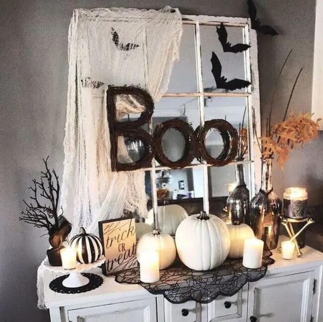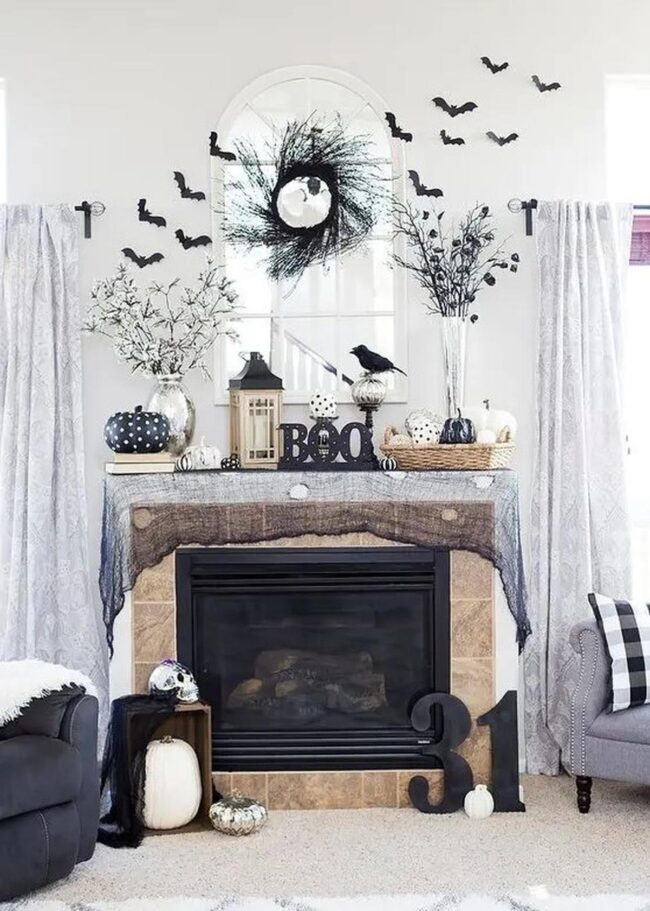 Dramatic black mesh cloth drapes elegantly above the fireplace, showcasing festive carved pumpkins and a charming "Boo" sign that instantly draws curious glances.