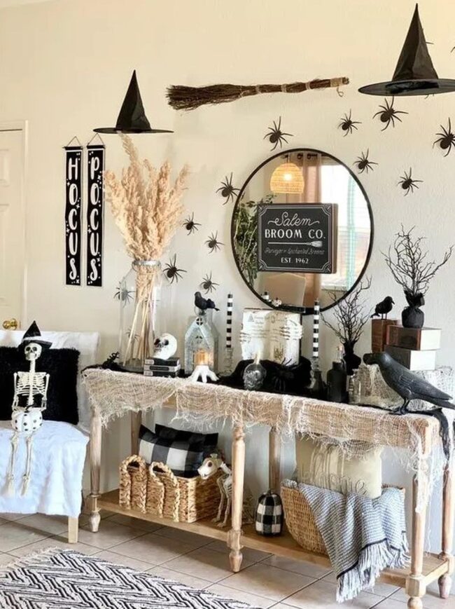 Vintage framed artwork featuring witch motifs adds understated character, connecting traditional Halloween spirit with modern design sensibilities.