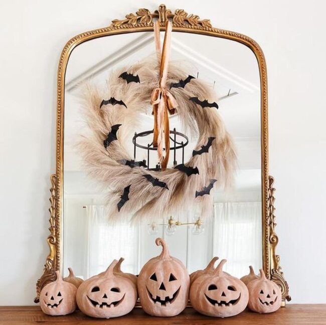 Mirror magic springs to life with a grand gold frame showcasing five smiling peach pumpkins perched on wooden surfaces, while black bats flutter around a fuzzy wreath hanging delicately.
