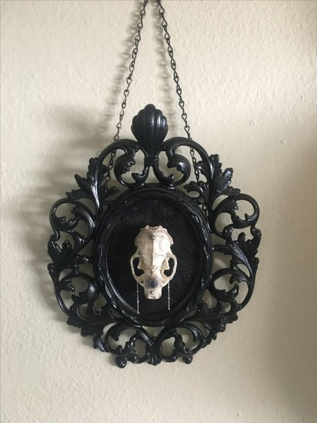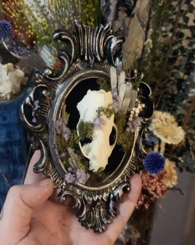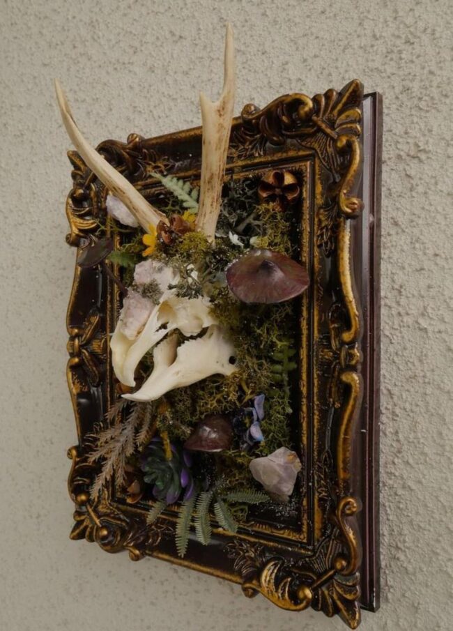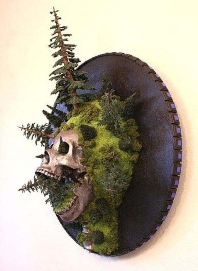 Moss skull wall art weaves magic through unexpected natural elements, drawing your eyes into its haunting landscape.