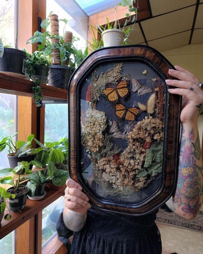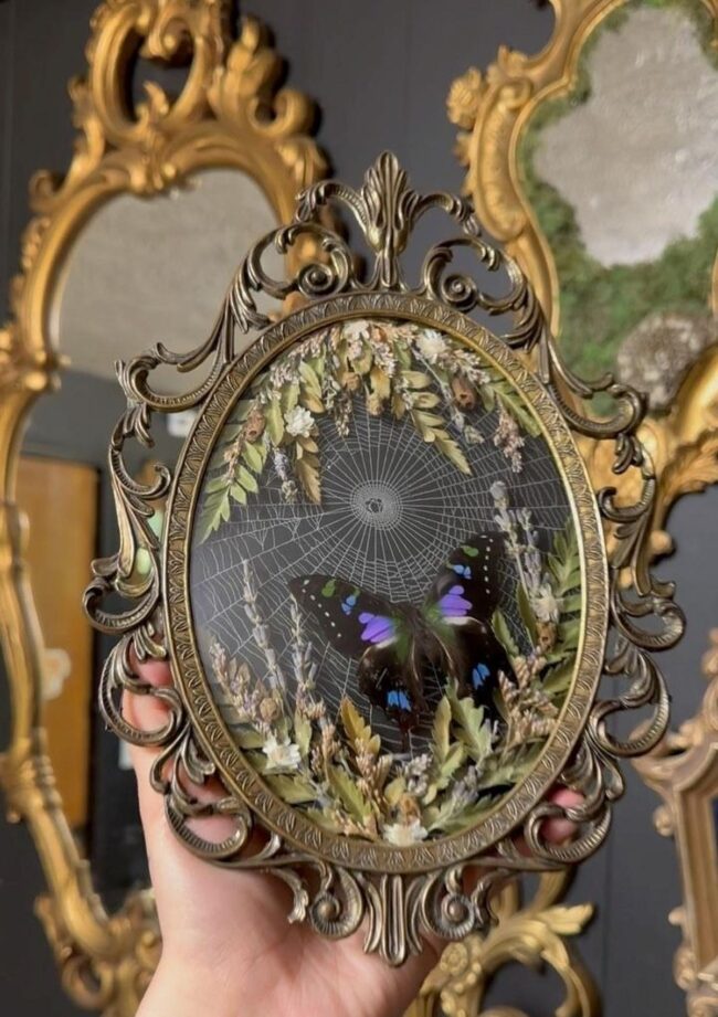 Brilliant blue and purple butterfly wing spots contrast beautifully against dried flower backgrounds, making each piece feel like a precious natural snapshot.