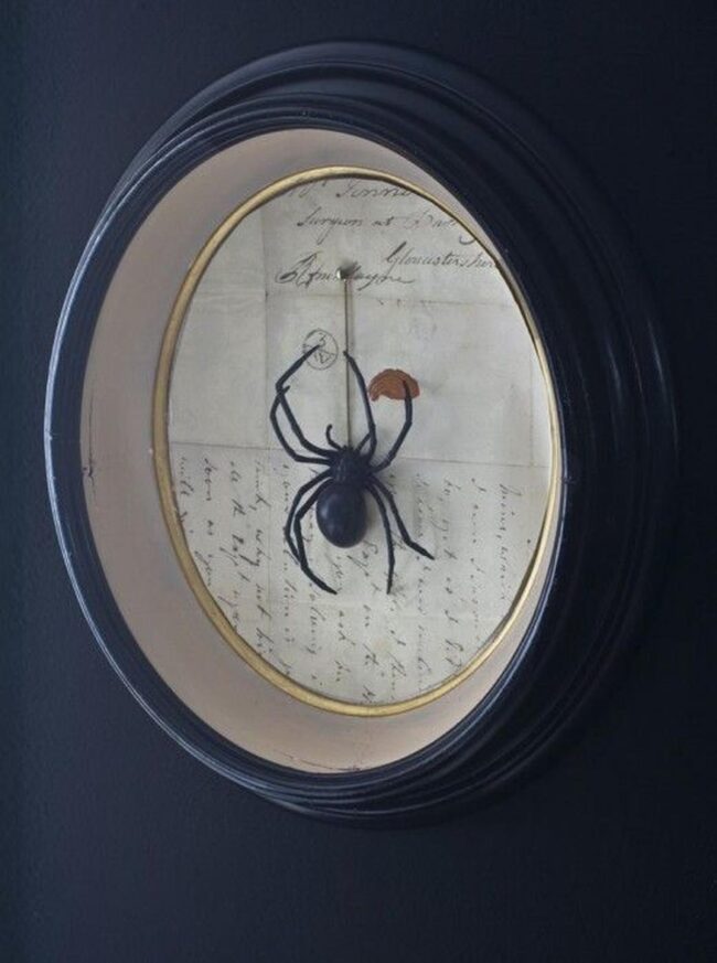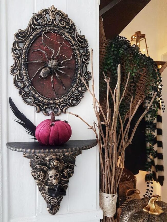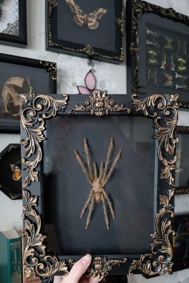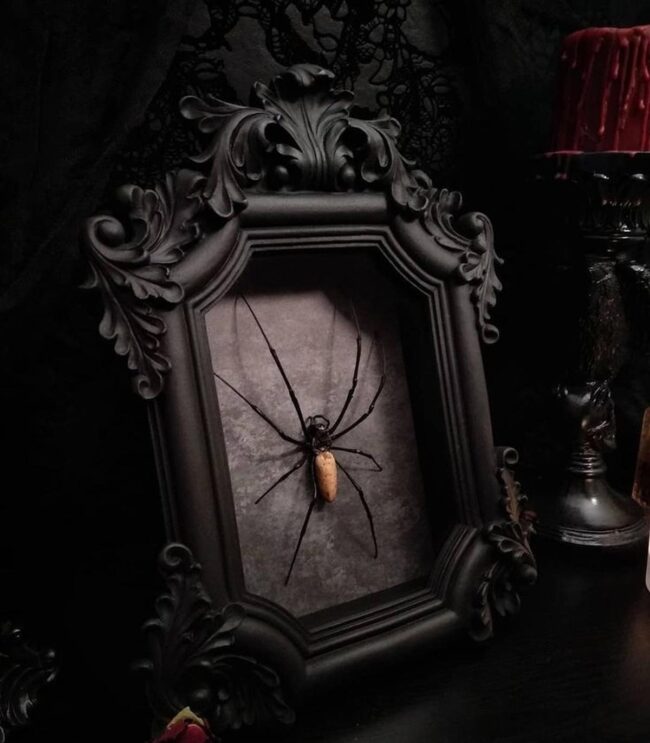 Your eye will immediately catch the massive spider framed in ornate gold, commanding attention with its dramatic silhouette against deep walls.