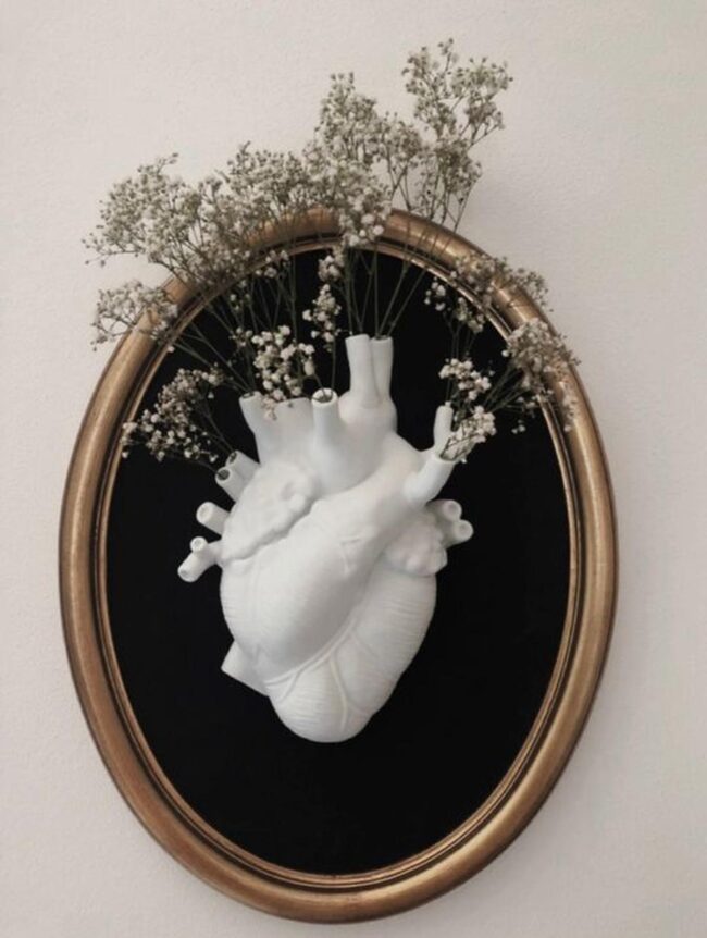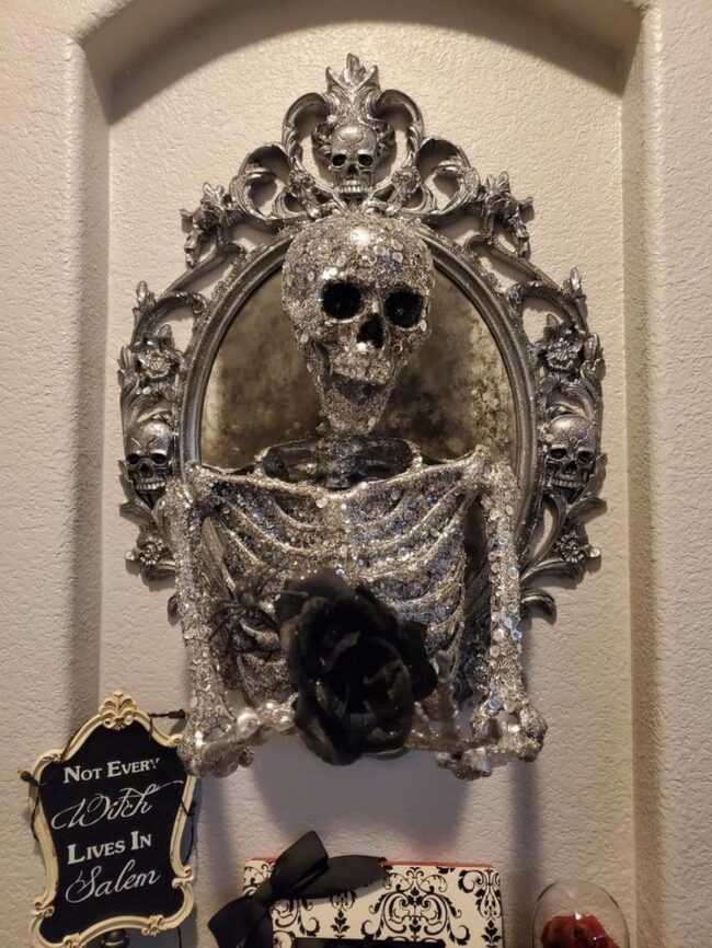 Silver-edged picture frames showcasing bony figures holding dramatic roses create unexpected drama in your space.