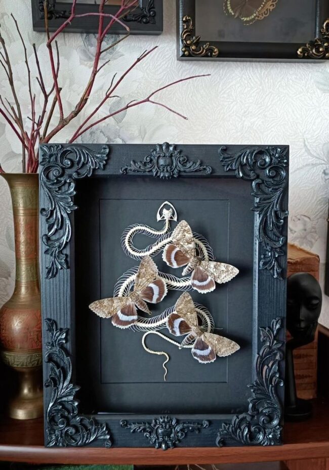 Black ornate frames cradle extraordinary art pieces like delicate butterfly wings dancing around intricate snake bone structures, catching every wandering gaze.
