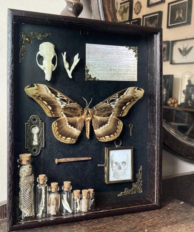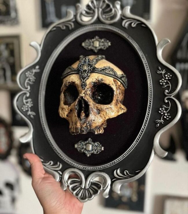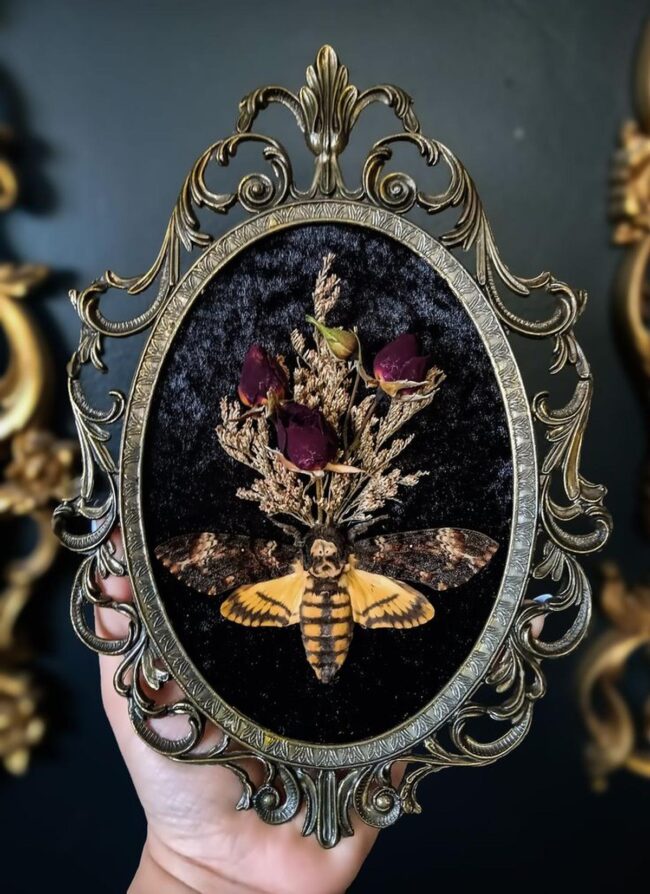 Dark, moody colors and vintage gold frames elevate this unconventional artwork into a conversation starter that catches every eye.