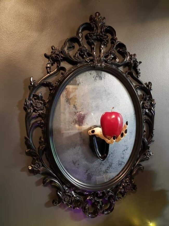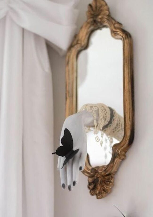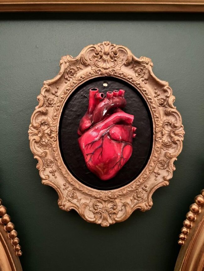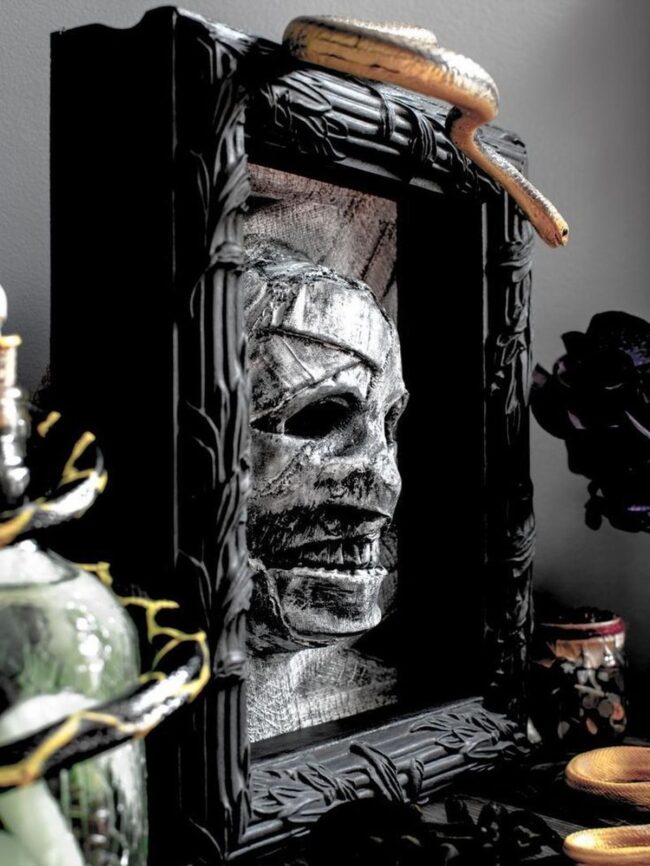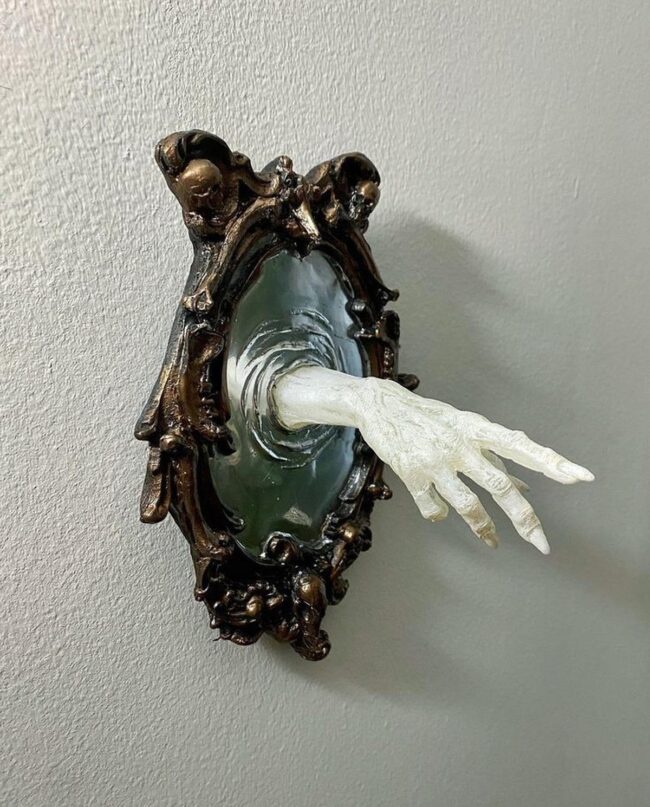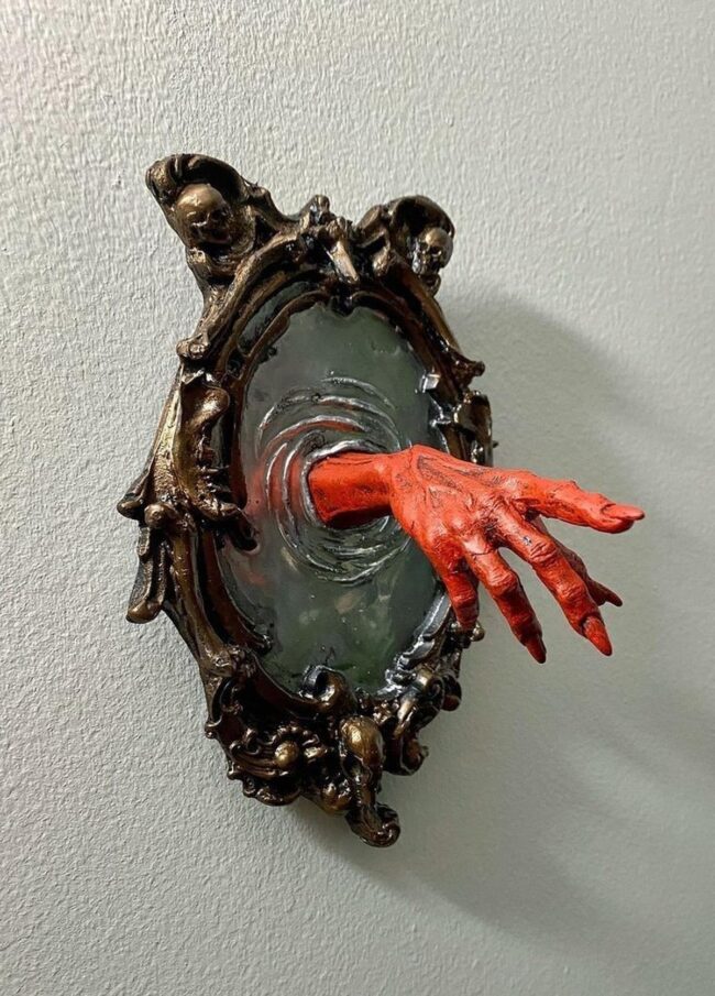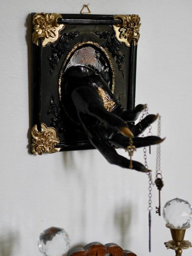 Scary wall decorations burst with dramatic personality, drawing your eye instantly with unexpected details like a shiny red hand emerging from a dark ornate frame.