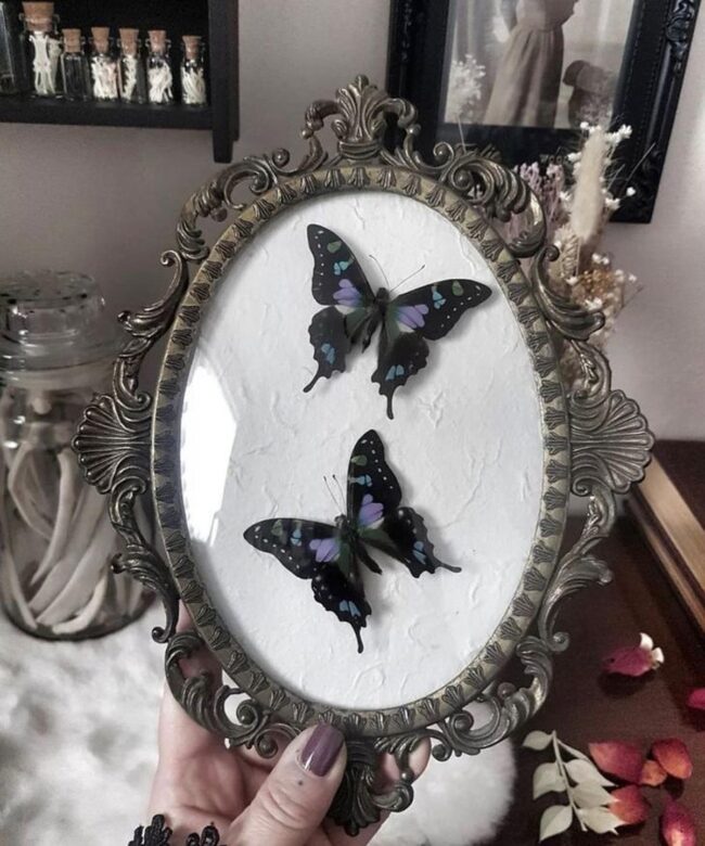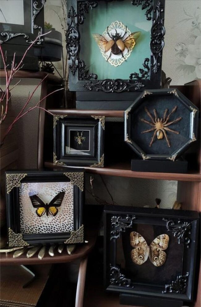 Mounted against deep black backgrounds, these shiny insect artworks become mesmerizing conversation pieces that radiate sophisticated charm.