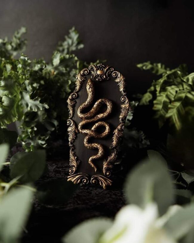 Dark mysterious spaces bloom with enchanting drama when golden serpents wind gracefully around ornate frames, casting mesmerizing shadows that instantly capture your eye.