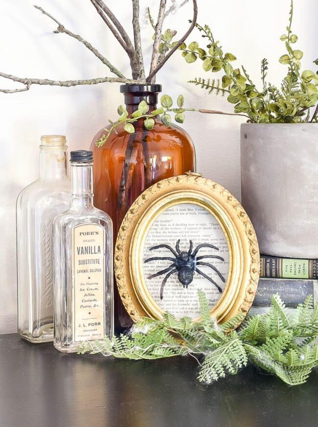 Old book pages featuring delicate black spiders add unexpected artistic flair to your arrangement.