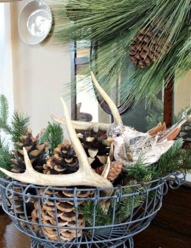 Woodland-inspired arrangements invite earthy charm with unexpected details like metal baskets displaying pinecones and delicate antler collections.