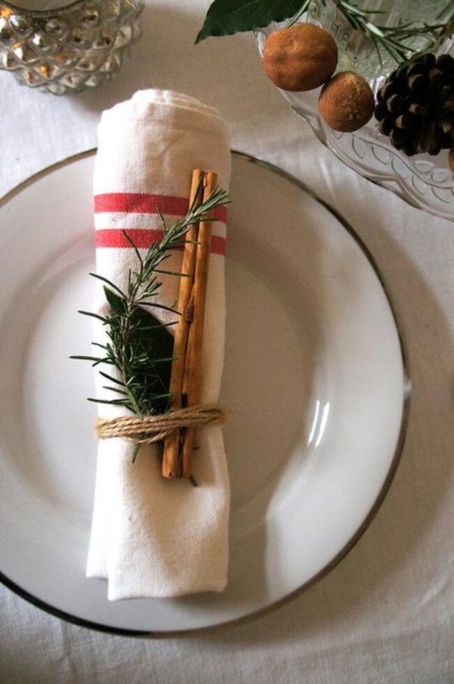 Crisp white napkins adorned with cinnamon sticks and green sprigs whisper subtle seasonal stories without saying a word.