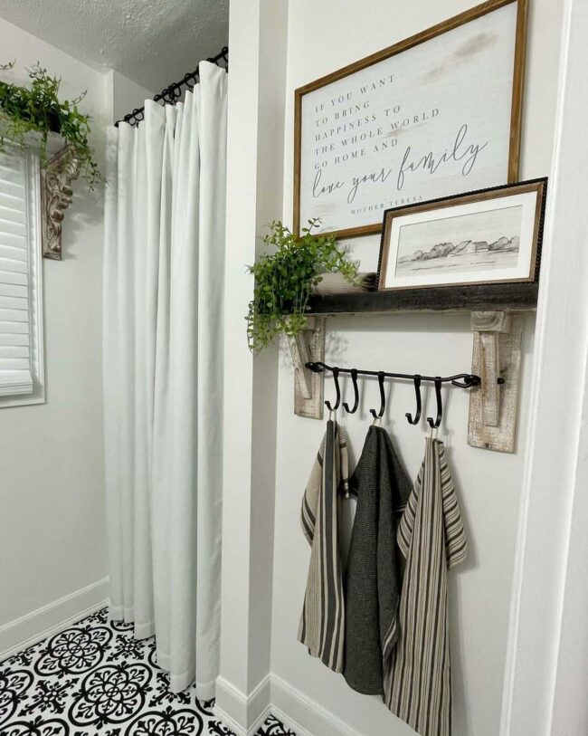Rustic white farmhouse bathrooms radiate charm with elegant wood shelving and thoughtful design details.