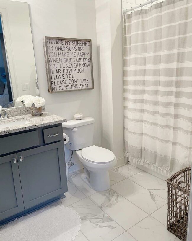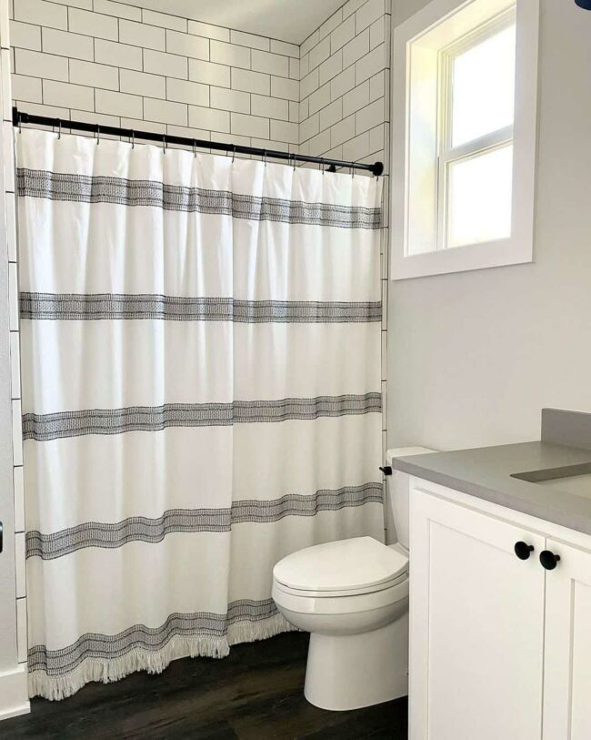 Gray and white striped shower curtains anchor modern farmhouse bathroom design with understated elegance.