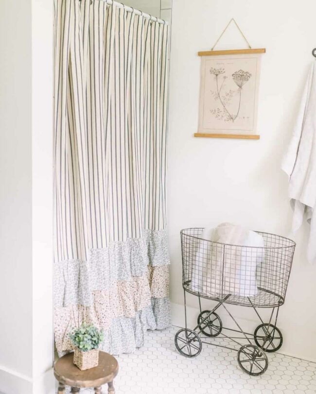 Heathered shower curtains with cream and taupe stripes instantly elevate a farmhouse bathroom's charm.