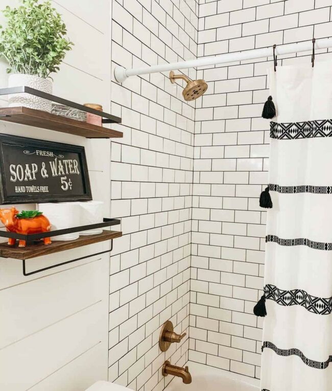 Black grout accentuates classic white subway tiles, bringing depth and contrast to the wall.