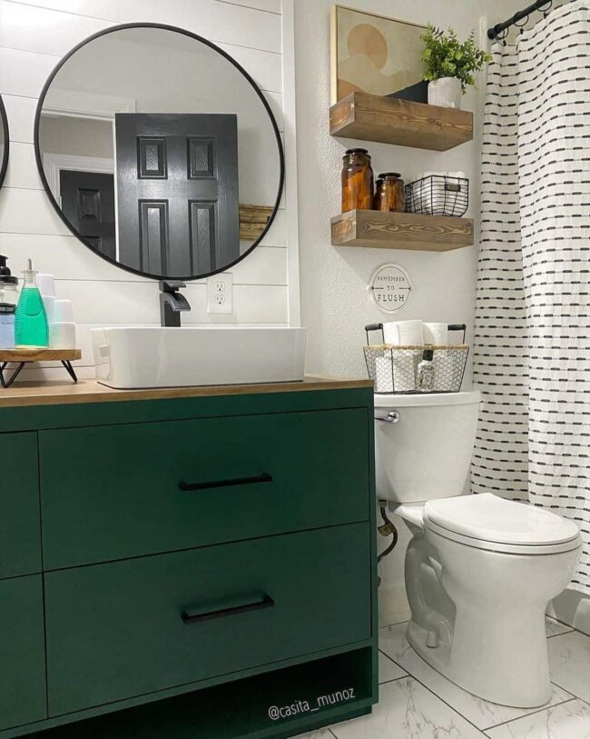 Rustic farmhouse bathrooms capture hearts with their serene and stylish design, where an emerald green vanity boldly commands attention against classic shiplap paneling.