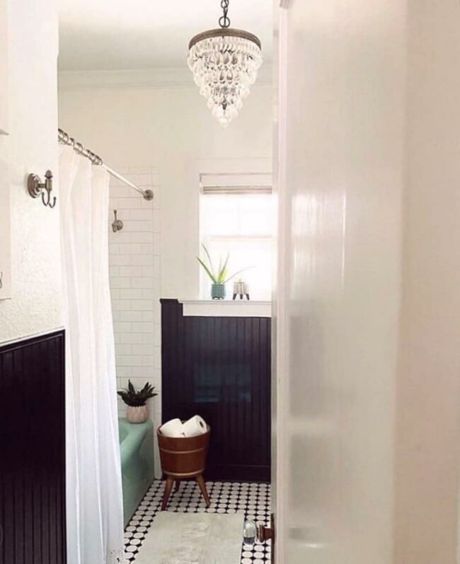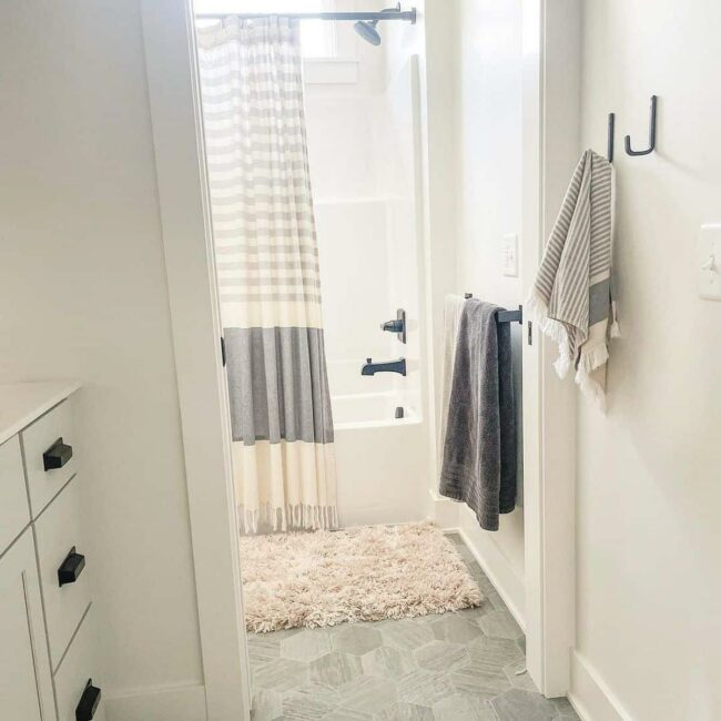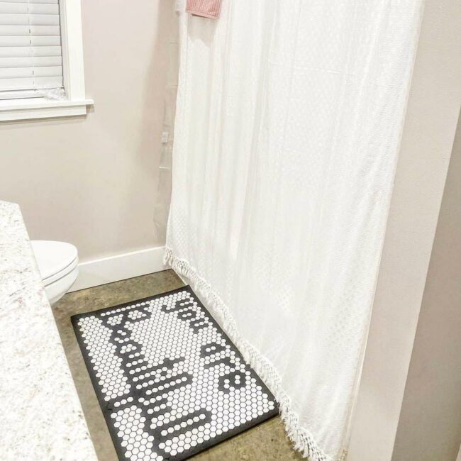 Black-and-white geometric bath mats introduce a striking contrast that enhances the room's visual interest.