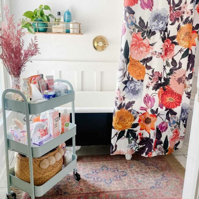 Vintage floral shower curtains introduce subtle pattern and visual interest without competing with other design components.