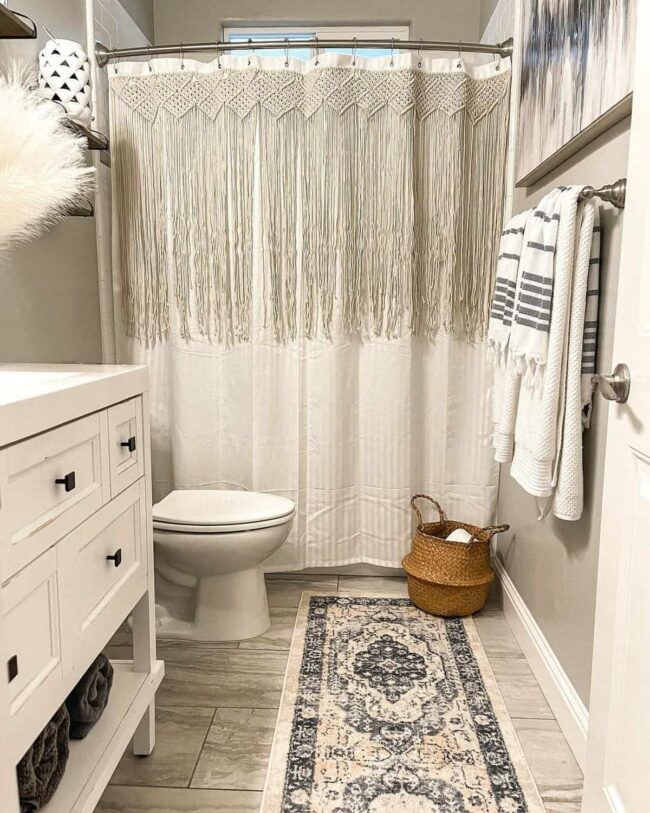 Macrame shower curtains elevate bathroom design with bohemian charm, featuring intricate patterns and long cotton chord fringe tassels that instantly capture attention.