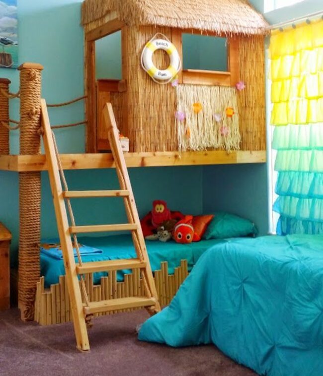 Kids' rooms burst with magic when parents unleash creativity, especially in this whimsical island-inspired sanctuary that captures ocean adventures through "Finding Nemo" color palettes.