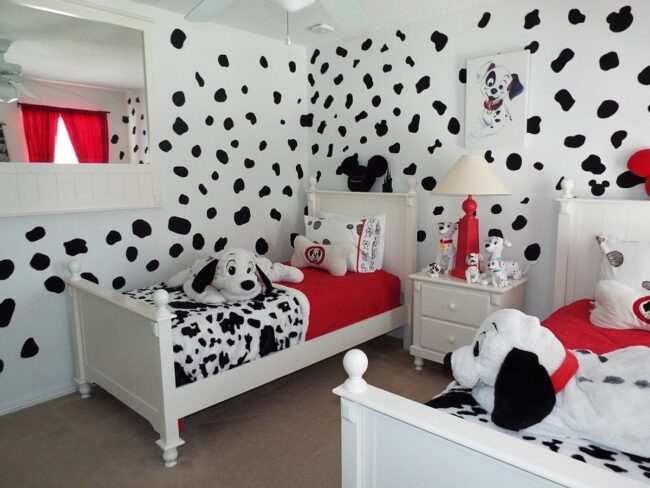 Cheerful dalmatians watch approvingly from their spotted perches, overseeing a room that celebrates their iconic black and white style.