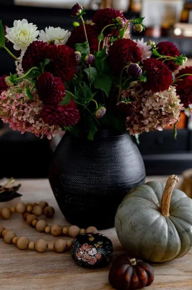 Pumpkins nestled in metal containers bring organic charm, blending seasonal spirit with elegant simplicity.