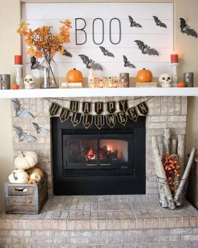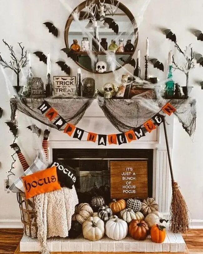 Pumpkins glow with festive cheer, nestled perfectly on the hearth beneath a striking black banner screaming Halloween spirit.