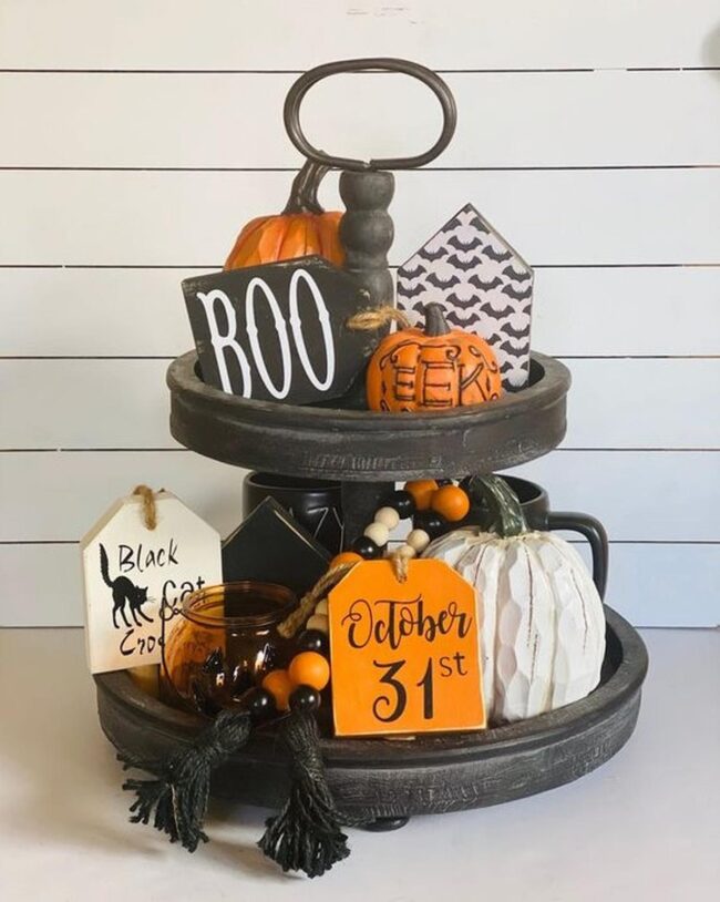 Pumpkin-packed Halloween magic springs to life on a sleek two-tiered black stand where cheeky orange gourds dance with personality.