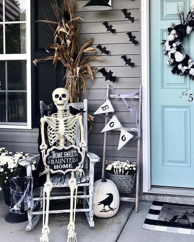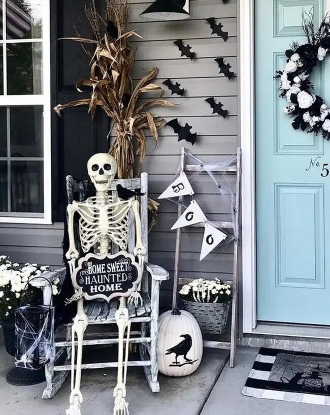 Whimsical skeleton friends lounging in chairs welcome visitors with their playful poses, adding a touch of humor to the seasonal decor.