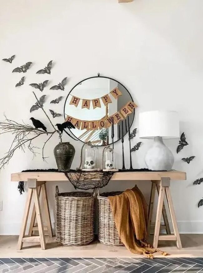 Tall windows frame a delicate twig wreath adorned with playful bat silhouettes, drawing natural light into your entryway.