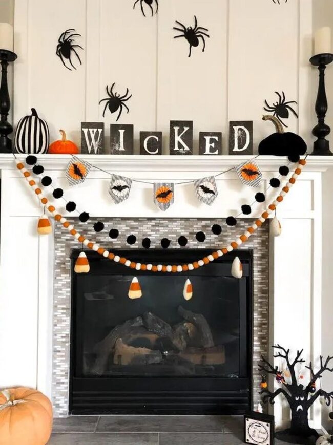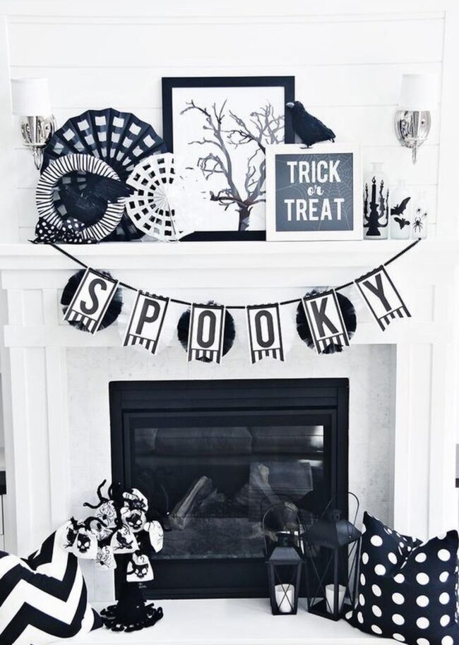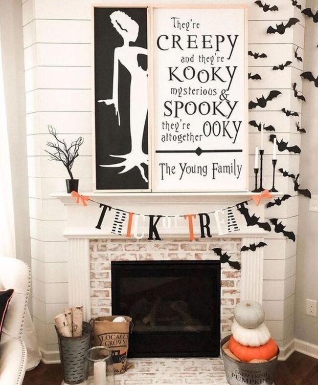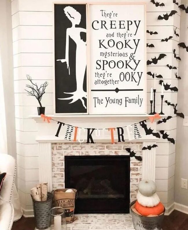 Halloween magic bursts through your living space with a killer fireplace setup that blends dramatic black and crisp white brick, setting an unforgettable seasonal stage.