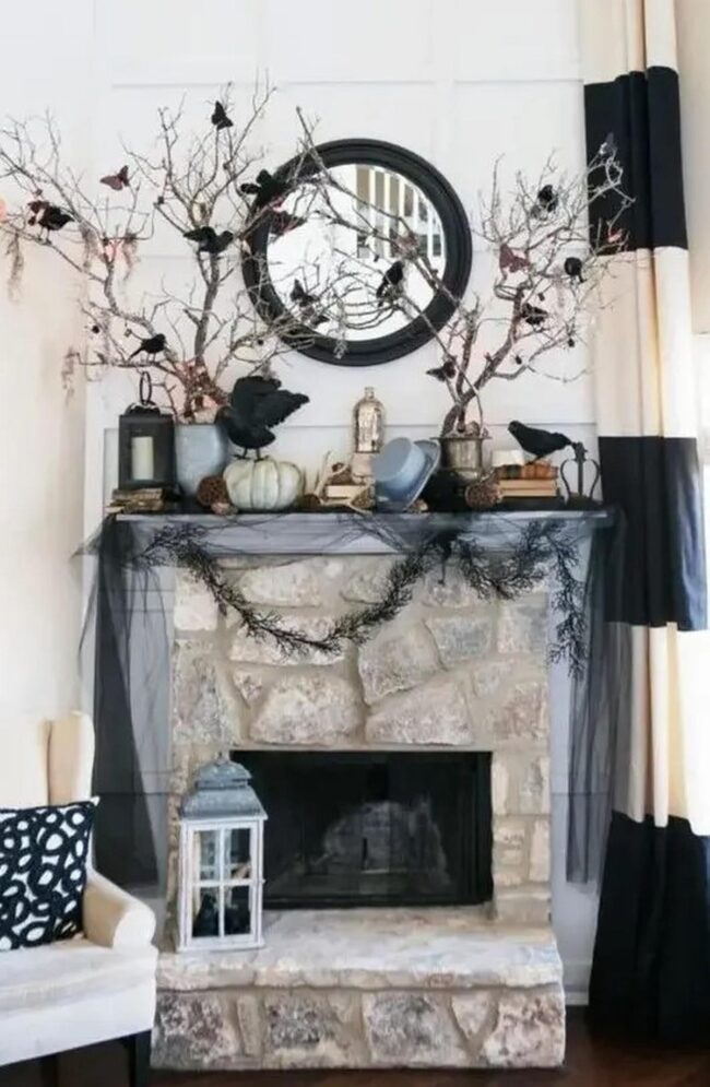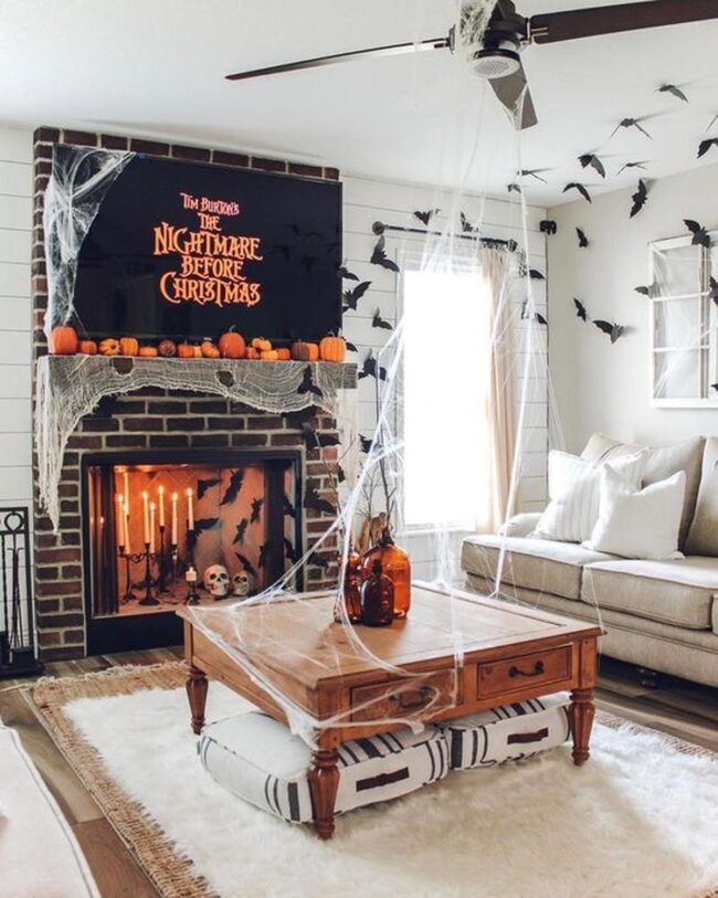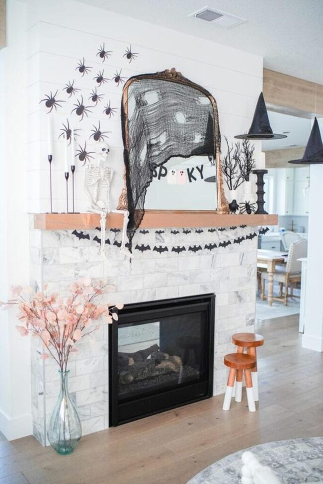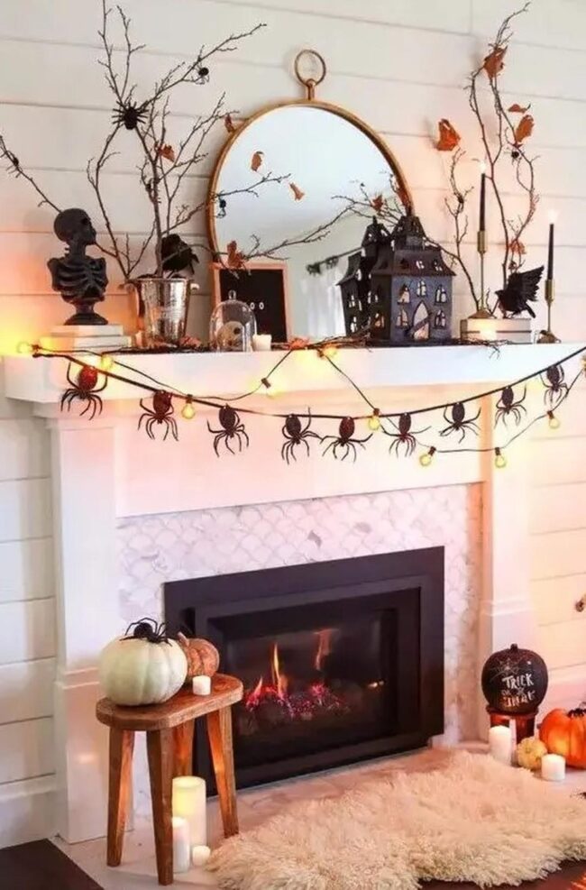 Delicate webs cascade from the mantel, whispering Halloween secrets without screaming for attention.