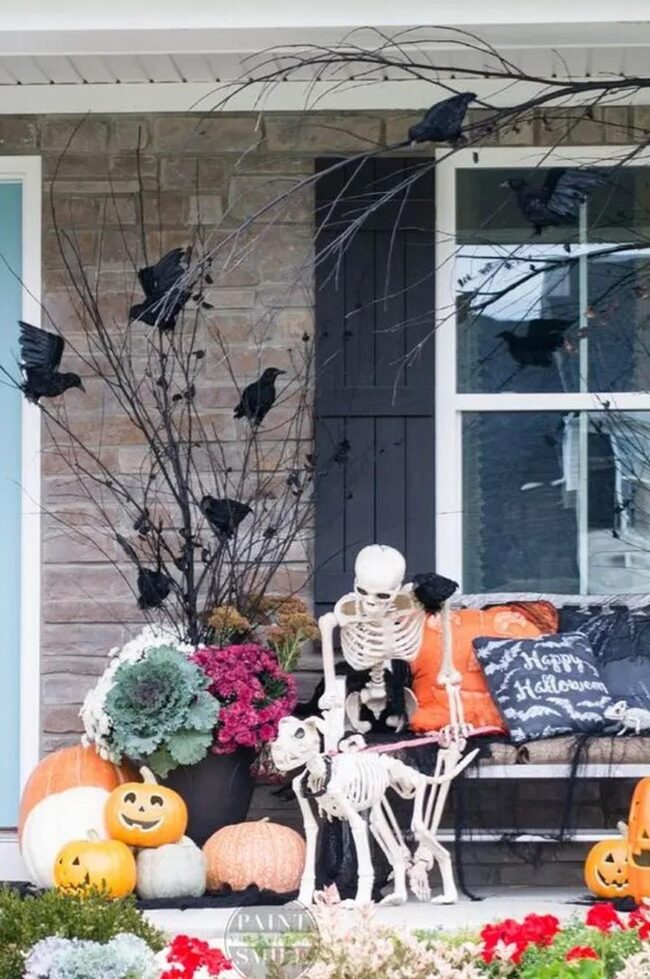 Halloween decorations explode with personality on this enchanting porch, where jack-o'-lanterns beam infectious grins while quirky skeletons (both human and furry companions) create instant charm.