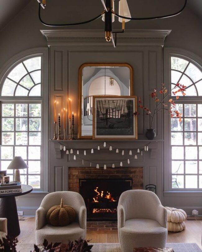 Orange pumpkins perched along mantles inject vibrant bursts of color that seamlessly blend with wooden furniture and soft white rugs.