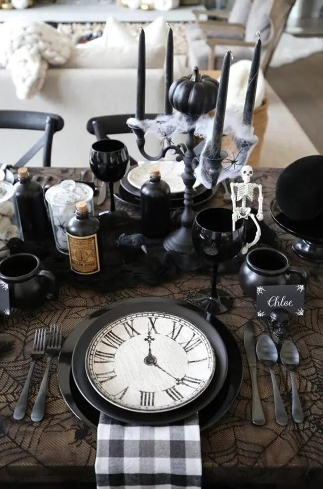 Vintage clock-faced plates with intriguing Roman numerals add unexpected character, while dark spiderweb-patterned linens weave mysterious shadows across your table's landscape.