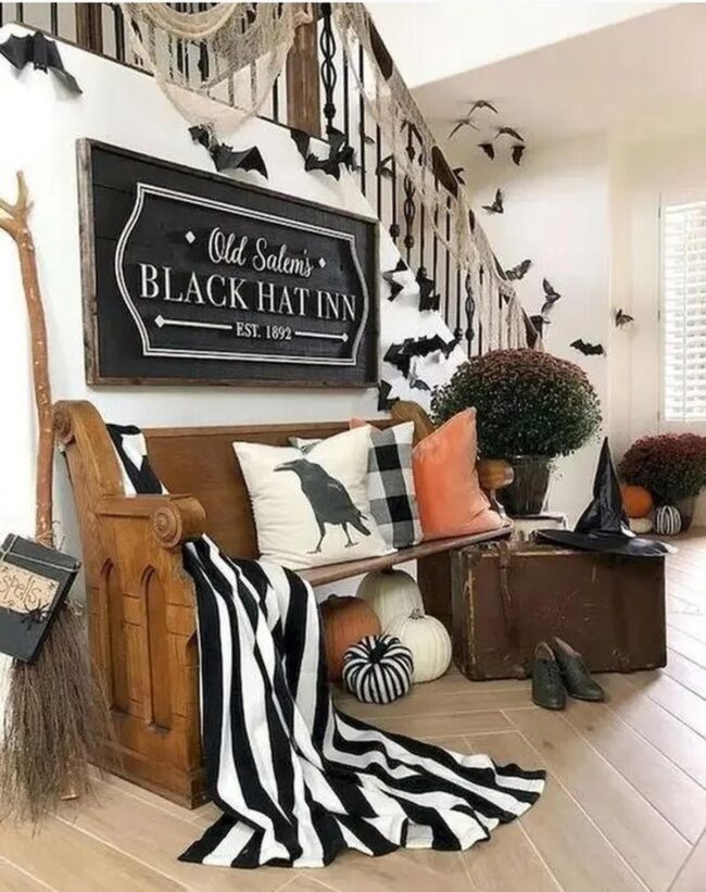 Staircase walls come alive with playful black and white bats dancing above a wooden bench adorned with checkered pillows and a striking crow design.