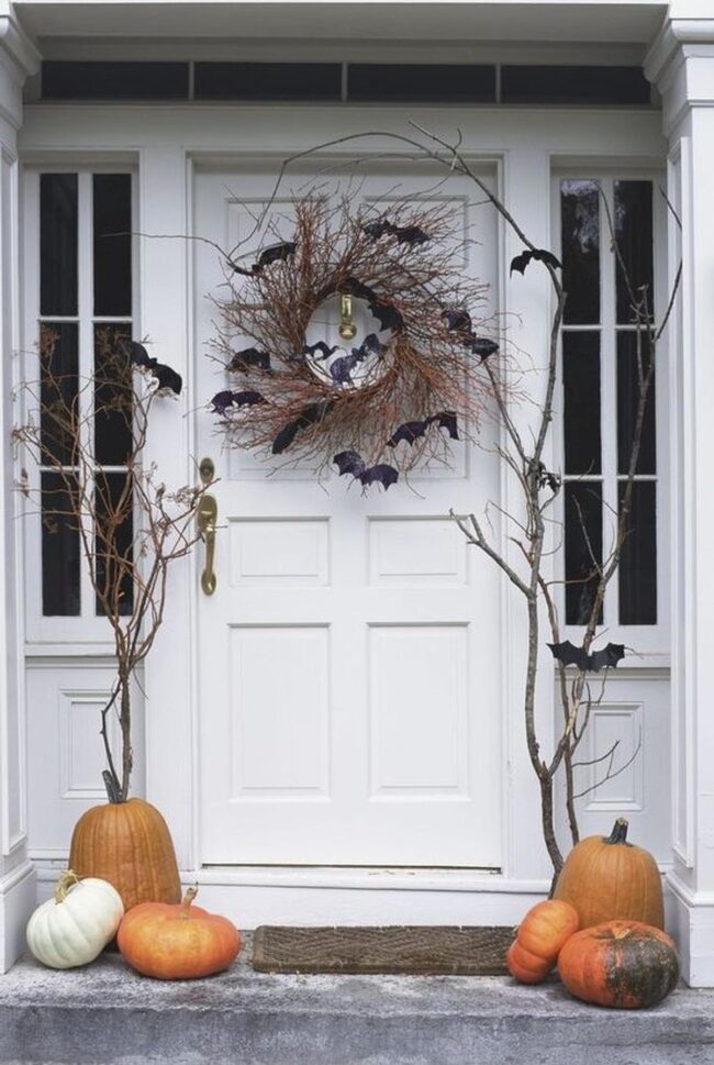 Black bats fluttering across crisp white door branches instantly spark festive magic without overwhelming your space.