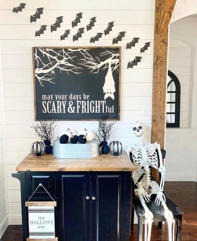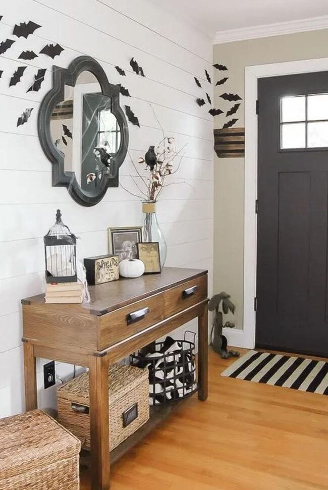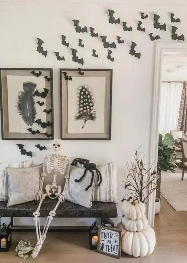 Halloween magic springs to life with unexpected charm when black paper bats dance across pristine walls, hovering above a moody bench.