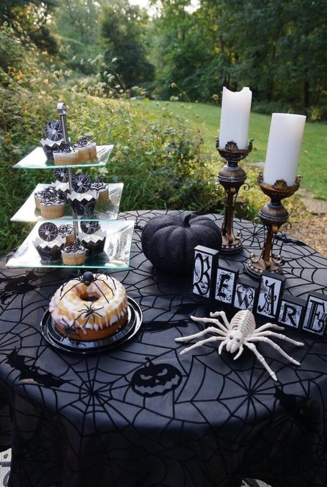 Dramatic black candles nestled within an intricate spider web-draped candelabra become the centerpiece's heart, surrounded by mischievous plastic spiders exploring every corner.
