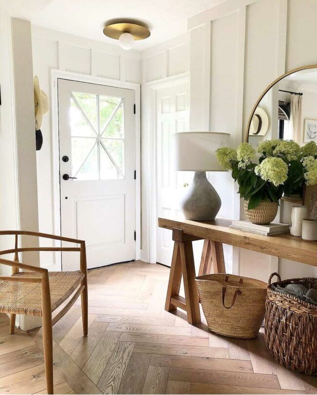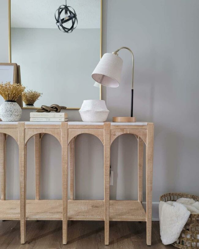 Nearby, a light wood console table provides a welcoming spot for dropping keys and bags, anchored by a chic white lamp that adds sophisticated flair.