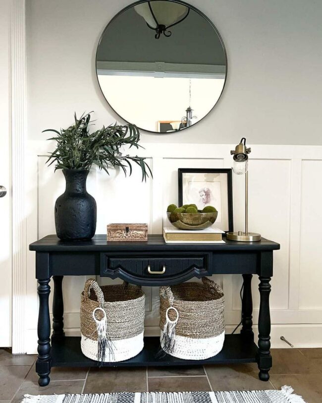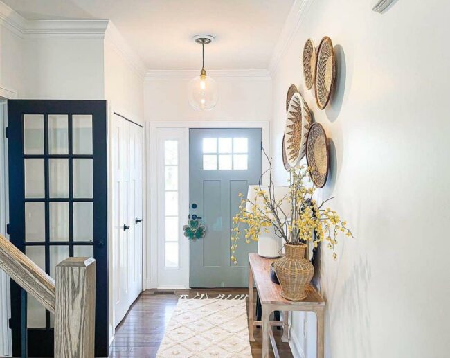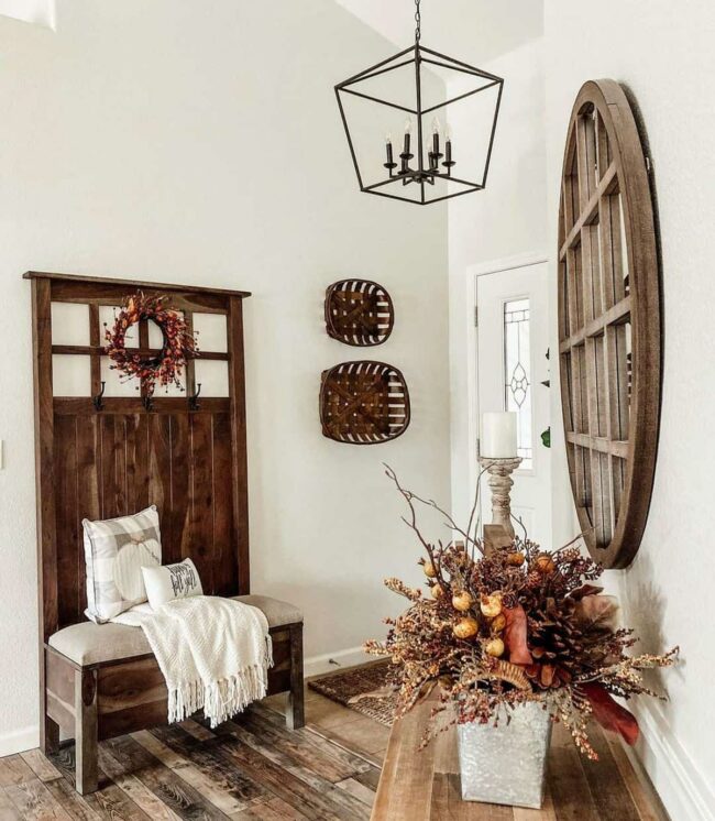 Tobacco basket wall decor adds unexpected texture and personality to entryway aesthetics.