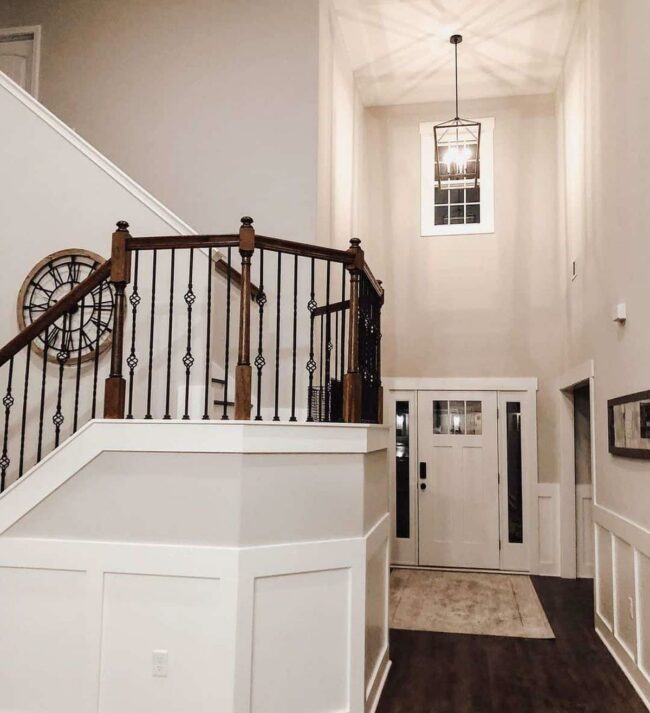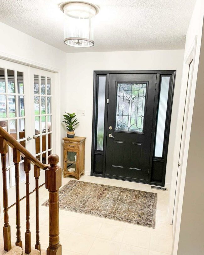 Black and brown lighting draws eyes the moment you enter this welcoming space, where a stained wood door with glass details stands proudly against white balusters.