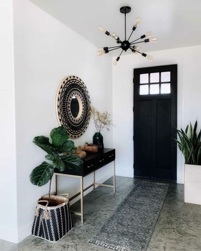 Black sputnik chandelier illuminates this modern entryway with dramatic flair, immediately catching attention.