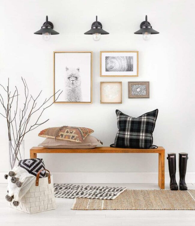 Light wood benches underneath create an inviting spot for removing shoes or setting down bags.