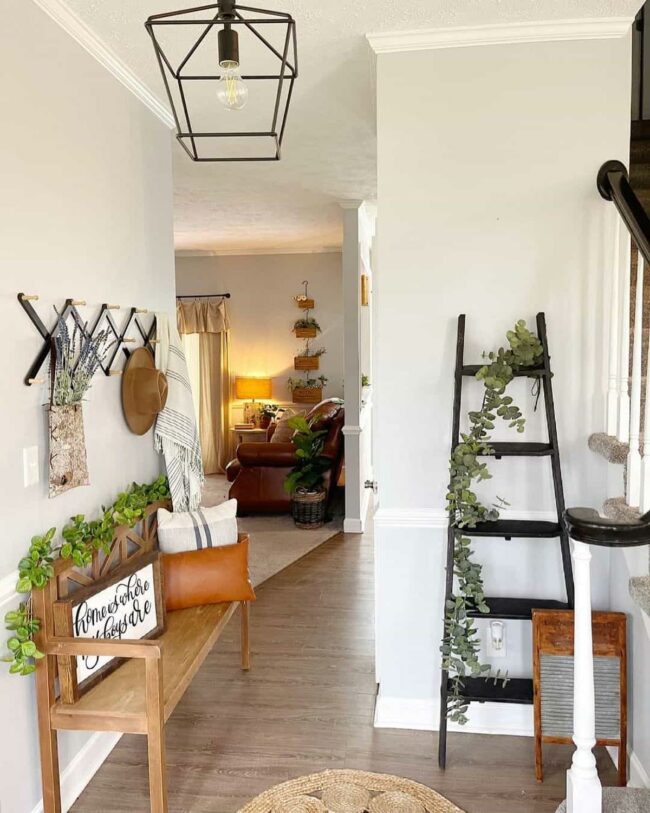 Lush greenery garland draped on a decorative black ladder adds natural texture and warmth to the space.