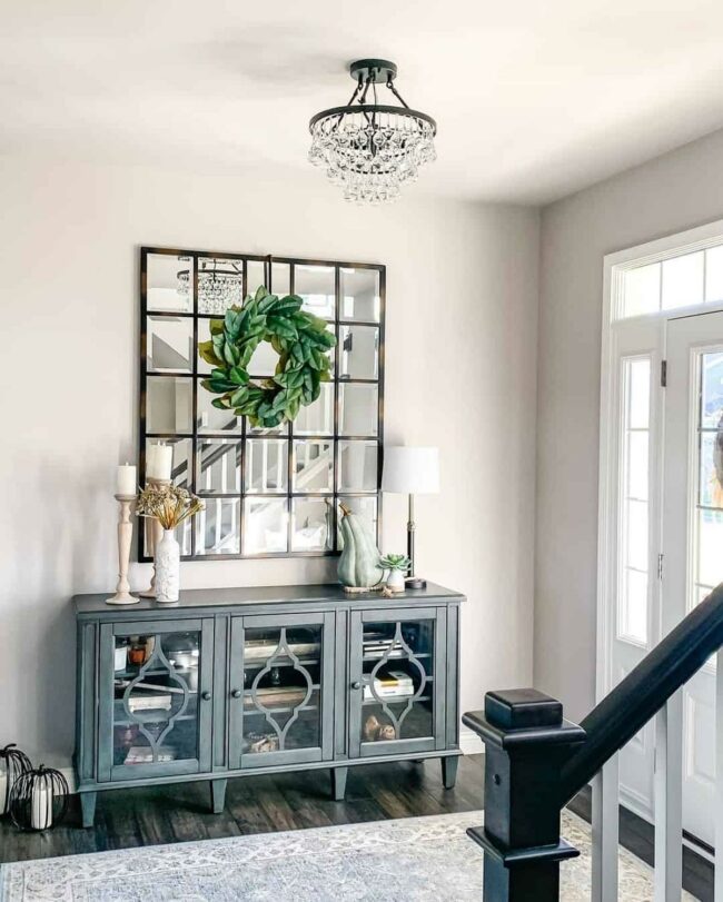 Sophisticated gray sideboards paired with glass surfaces offer perfect spots for keys and incoming mail.