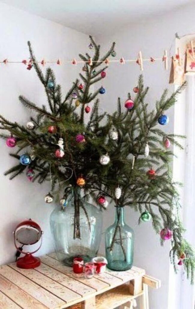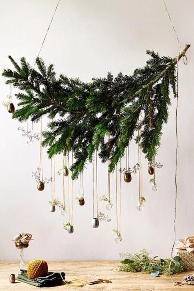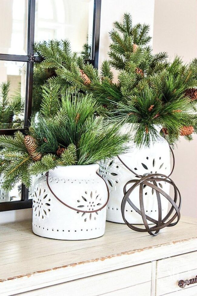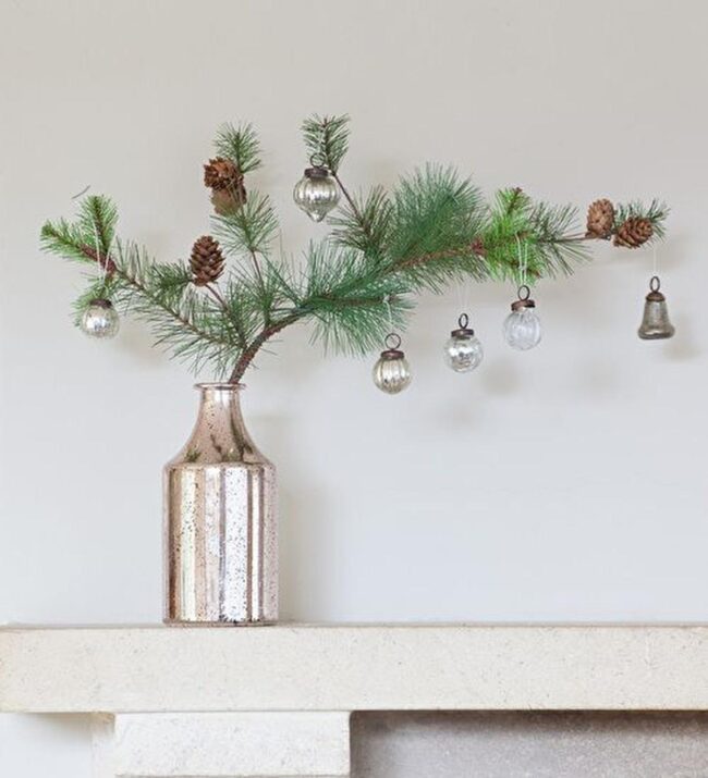 Deck out your space with festive magic by mixing natural pine branches in tall glass vases that instantly brighten any corner.