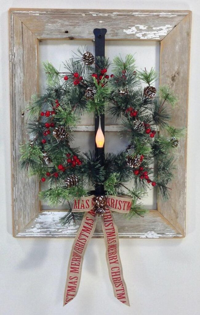 Weathered wooden frames embrace delicate wreaths bursting with emerald greenery and sparkling crimson berries, inviting warmth into your personal space.